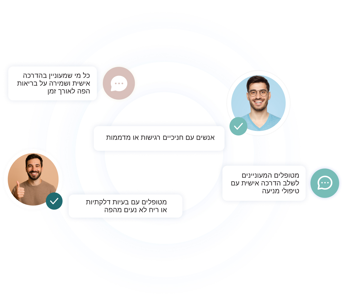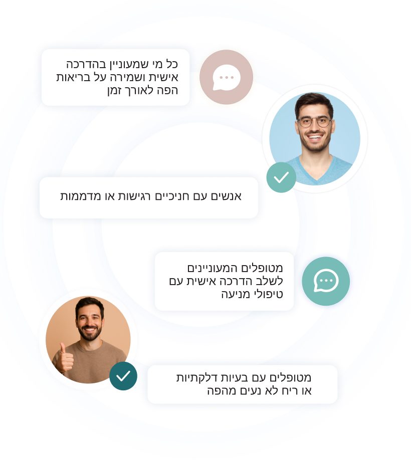 להסביר למטופלים שלי מה קורה אצלם בפה, להניק הנחיות פרקטיות ומדויקות, וללמד לבצע פעולות יומיומיות בביטחון ובקלות – ללא קשר לגיל או למצב.